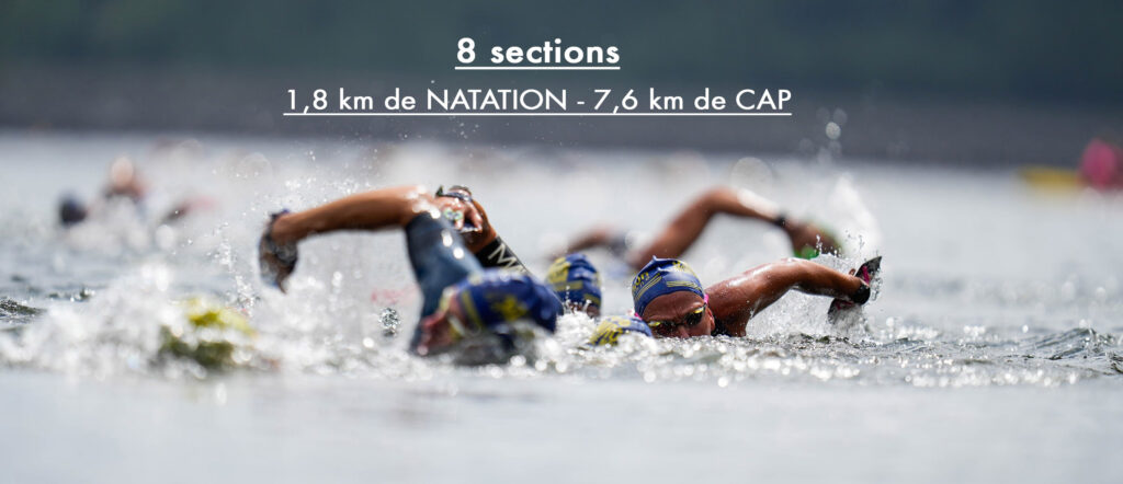 – 4 sections de natation (400 m à 500 m) – Distance totale : 1,8 km.